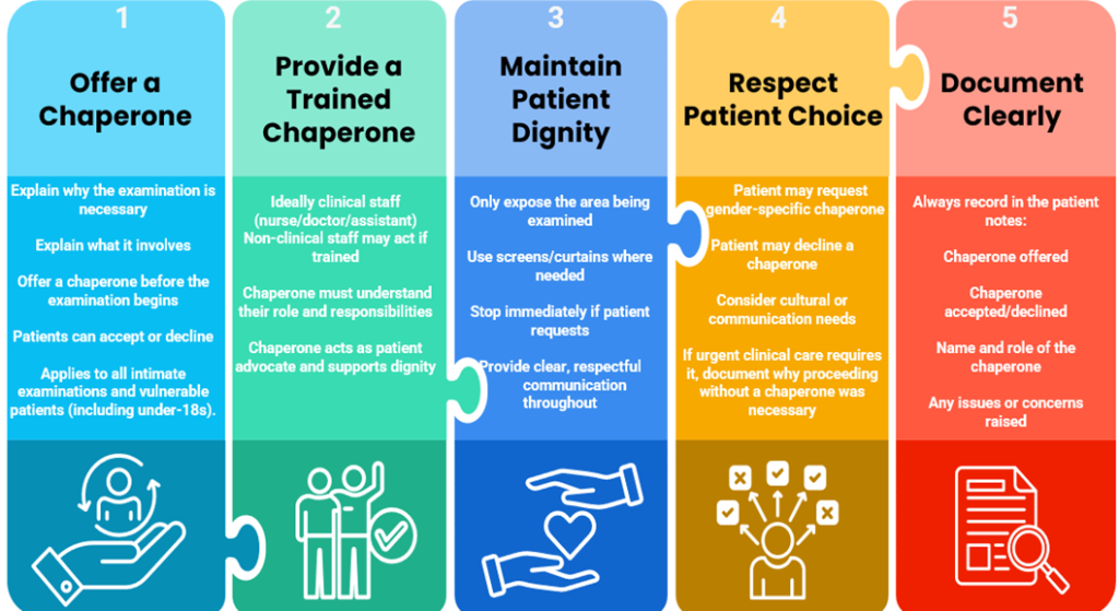 Patients are entitled to request a chaperone at any time. Information about the availability of chaperones is provided on our website, within the patient waiting area, and in all clinical consultation rooms. We recognise that patients may have cultural, religious, or gender preferences regarding who acts as their chaperone. We encourage patients to let us know their preference, and we will try our best to accommodate them.